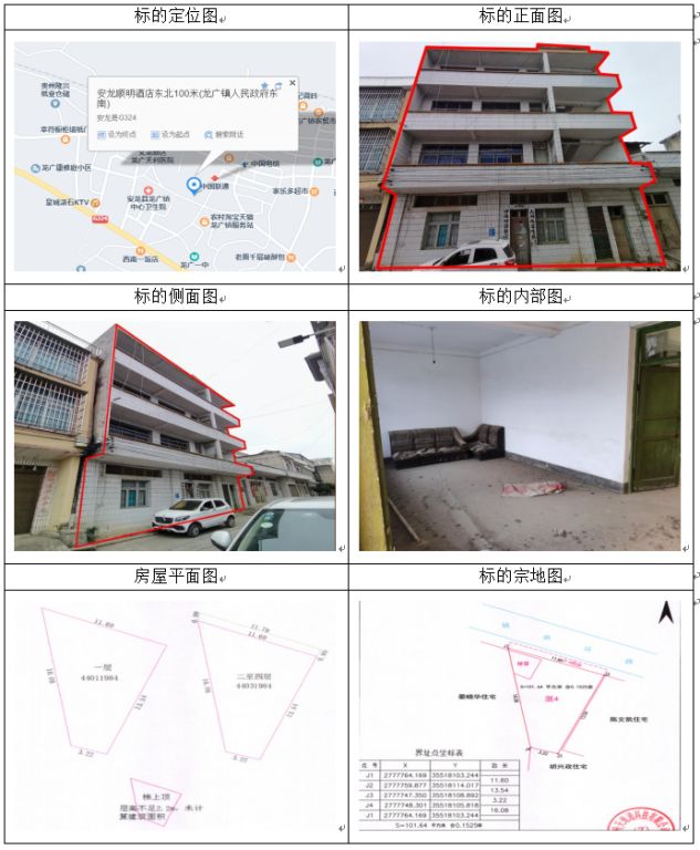 標(biāo)的坐落于安龍縣龍廣鎮(zhèn)南環(huán)路,房屋總層數(shù)4,證載建筑面積:453.34㎡,實(shí)測建筑面積:423.42,房屋產(chǎn)權(quán)證號:安房權(quán)證龍廣鎮(zhèn)字第00003464號,設(shè)計(jì)用途為住宅,混合結(jié)構(gòu);土地使用權(quán)證號:安國用(2014)第11號,證載土地使用權(quán)面積:98.7㎡,實(shí)測土地使用權(quán)面積:101.64㎡,地類(用途)住宅用地,使用權(quán)類型為出讓,終止日期為2054年11月22日止。