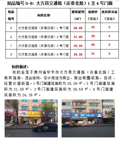 5、大方縣交通路(慶北春路)4間門面(建筑面積分別為:28.09、31.09、39.59、24.38;