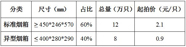 標的物為非循環(huán)利用紙箱,年產(chǎn)數(shù)量為20余萬只,由標準煙箱(占比約60%)和異型煙箱(占比約40%)組成,使用正常。參加拍賣會的意向競買人須具備紙制品再生能源、廢舊物資回收等相關資質(zhì)。