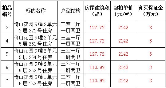 3、倚山花園5套住宅房產(chǎn),建筑面積:110.99—127.72㎡,起拍價:2142元/㎡;