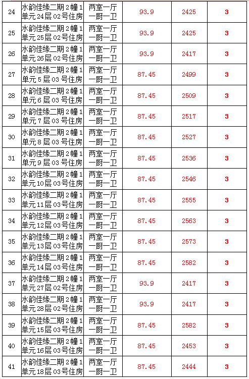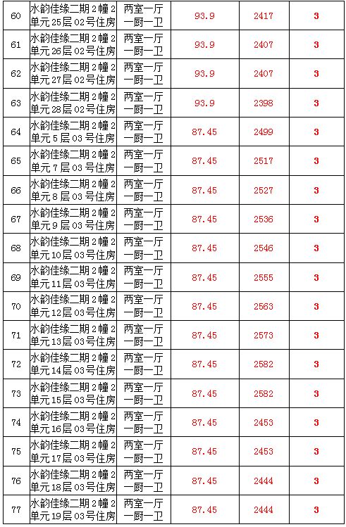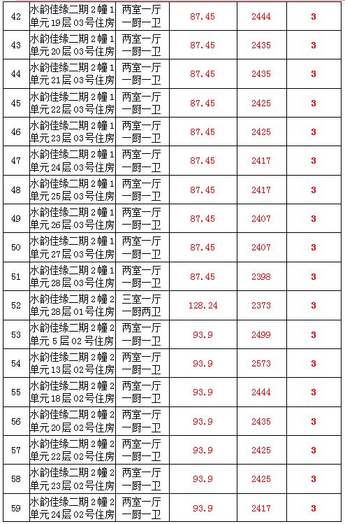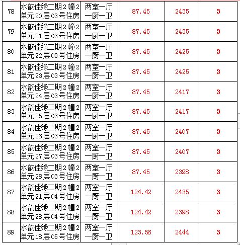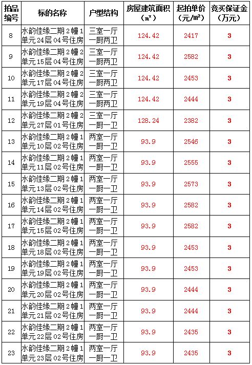 2、水韻佳緣82套住宅房產(chǎn),建筑面積:87.45—128.24㎡,起拍價:2373—2582元/㎡;