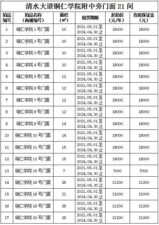 1.拍品1至21號標的位于銅仁市清水大道銅仁學院附中旁,面積7——28㎡,租賃期3年(2021.05.01至2024.04.30止),交通便利,人流量大。