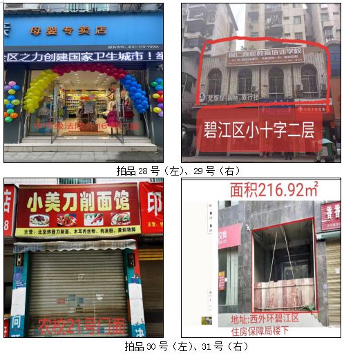 1.拍品22至28號標的位于銅仁市中級人民法院外,面積:19.35——30.86㎡,租賃期3年(2021.05.01至2024.04.30止),交通便利,其中28號標的包含3個門面(市直91號、92號和93號)為整體拍租。