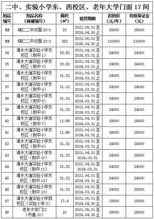 1.拍品32號標的位于銅仁二中對面,面積23㎡,租賃期3年(2021.05.01至2024.04.30);