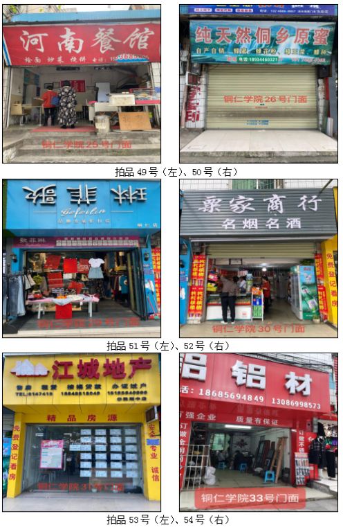 1.拍品49至66號標的位于銅仁市清水大道銅仁學院附中旁,面積15——44.4㎡,租賃期3年(2021.05.01至2024.04.30止),交通便利,人流量大。