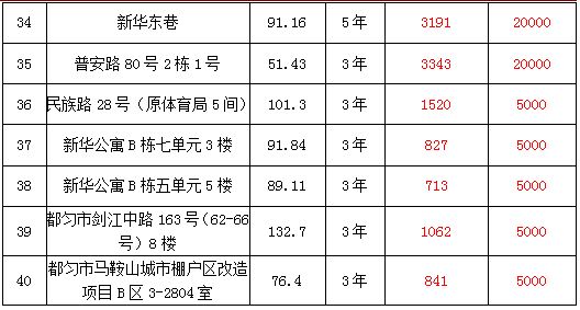 2、都勻市大十字三角巷、西苑小區(qū)、新汽車(chē)站對(duì)面、新華東巷、新華公寓、劍江中路、馬鞍山城市棚戶(hù)區(qū)、石惠公寓等10處房屋3年-5年租賃權(quán),面積約13.27㎡-221.94㎡;