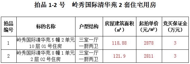 1、關(guān)嶺縣嶺秀國(guó)際2套住宅房產(chǎn),建筑面積:118.88—121.9㎡,起拍價(jià):2811—2878元/㎡;