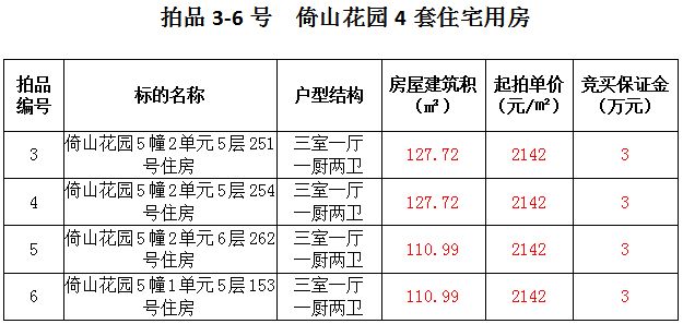 3、倚山花園4套住宅房產(chǎn),建筑面積:110.99—127.72㎡,起拍價(jià):2142元/㎡。