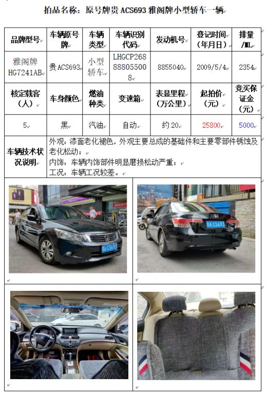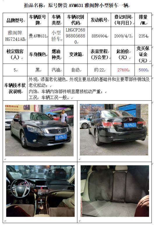 貴州春秋拍賣(mài) 奧迪牌、雅閣牌等3輛機(jī)動(dòng)車(chē)拍賣(mài)公告