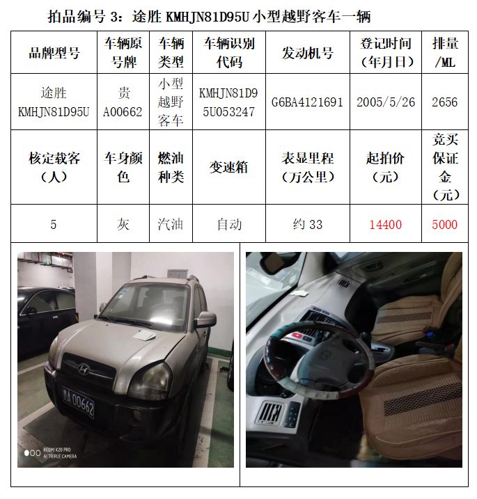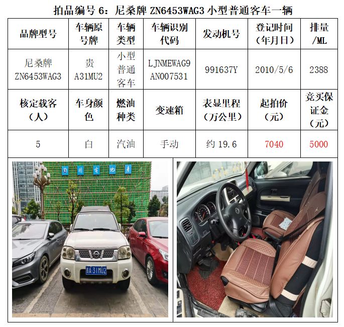 一、拍賣標(biāo)的:雅閣HG7200小型轎車1輛、別克牌SGM6527AT小型普通客車1輛、途勝KMHJN81D95U小型越野客車1輛、長城牌CC6460KM29小型越野客車1輛、雪佛蘭SGM6470TAXD小型普通客車1輛、尼桑牌ZN6453WAG3小型普通客車1輛,索蘭托KNAKU811小型普通客車1輛,共計(jì)7輛車。