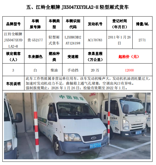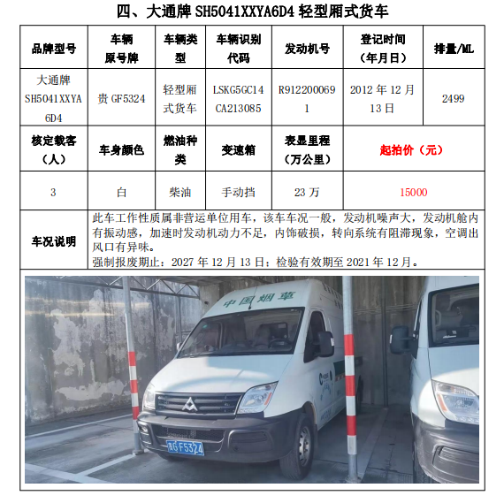 大通牌SH5041XXYA7D4輕型廂式貨車2輛、大通牌SH5041XXYA6D4輕型廂式貨車1輛、江鈴全順牌JX5047XXYDLA2-H輕型廂式貨車2輛、江鈴全順牌JX5047XFWMD小型專項作業(yè)車1輛、五十鈴牌QL1020UGDSC輕型普通貨車1輛、獵豹牌CFA6470M3小型普通客車1輛、獵豹牌CFA6470LA小型越野客車1輛,共計9輛車整體拍賣。