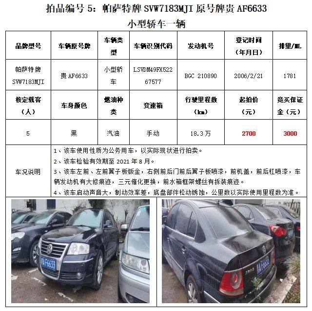 捷達(dá)牌FV7160GiF E3小型轎車(chē)3輛、榮威牌CSA7181AB小型轎車(chē)3輛、帕薩特牌SVW7183MJI小型轎車(chē)1輛、別克(BUICK)牌SGM6512GL8小型普通客車(chē)1輛、廣州雅閣HG7240轎車(chē)1輛、邁騰牌FV7187T小型轎車(chē)1輛,共計(jì)10輛車(chē)。