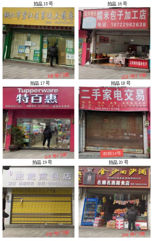 拍品14至22號標(biāo)的:位于清水大道銅仁農(nóng)校旁,地理位置優(yōu)越,屬于黃金大道。附近有大專、中學(xué)、小學(xué)、幼兒園等,教學(xué)配套齊全;擁有眾多小區(qū),人口流動能力強,固定人口較多;周圍有超市、商場,人口流動性強。地理位置優(yōu)越,屬于臨街門店,升值空間較大;地區(qū)基礎(chǔ)設(shè)施完善,公共交通、公共停車設(shè)施的增加,使該地升值空間進一步增大;建筑結(jié)構(gòu):磚混,面積:27.6㎡至42.4㎡不等(具體面積見上表),租賃期3年(具體日期見上表),保養(yǎng)情況:較好。