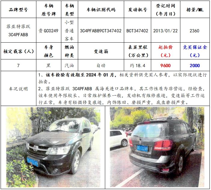 拍品編號1:菲亞特菲躍3C4PFABB小型普通客車一輛(車輛原號牌:貴GC0249);