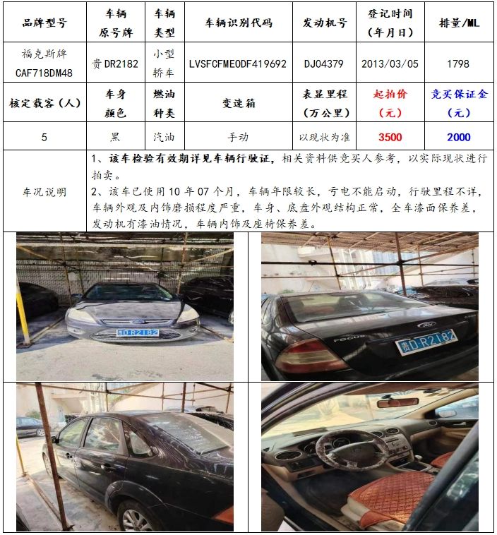 拍品編號3:??怂古艭AF718DM48小型轎車一輛(車輛原號牌:貴DR2182);