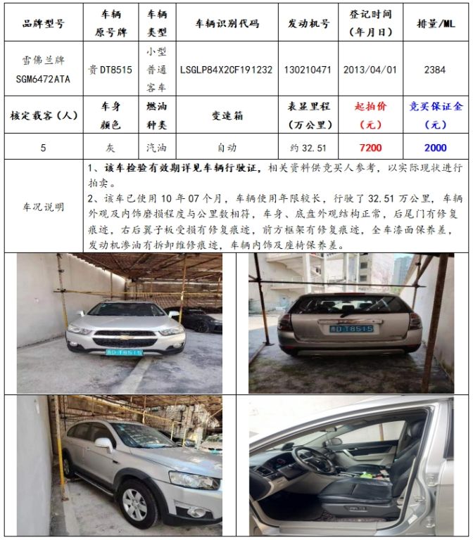 拍品編號4:雪佛蘭牌SGM6472ATA小型普通客車一輛(車輛原號牌:貴DT8515);