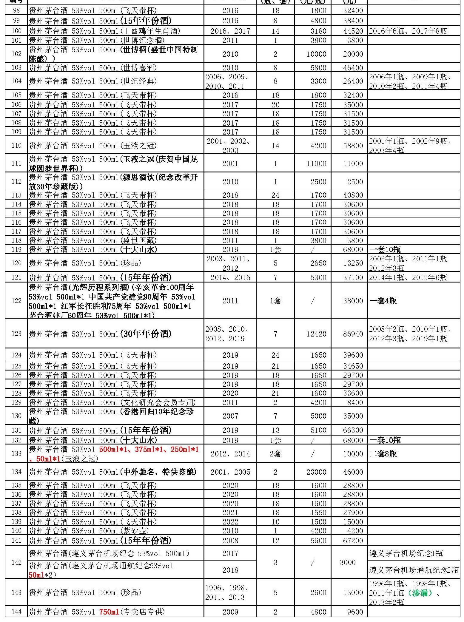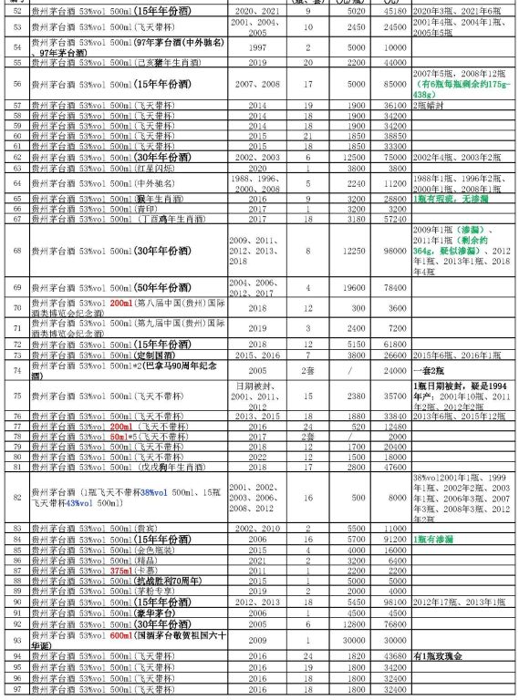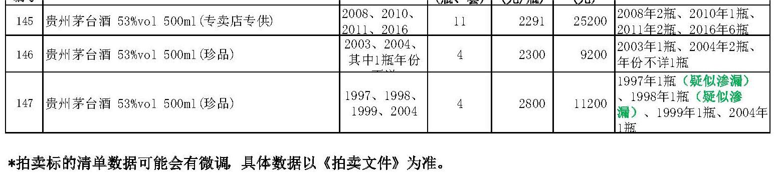 罰沒物品——貴州茅臺酒約1600瓶(其中有各類茅臺酒及各類生肖酒、15年、30年、50年年份酒,還有巴拿馬100周年紀念酒、香港回歸10年紀念酒、人民大會堂特供陳釀及多款特制紀念酒),詳見《拍賣標(biāo)的清單》。全部拍品經(jīng)權(quán)威機構(gòu)鑒定。