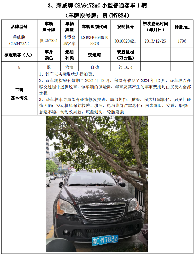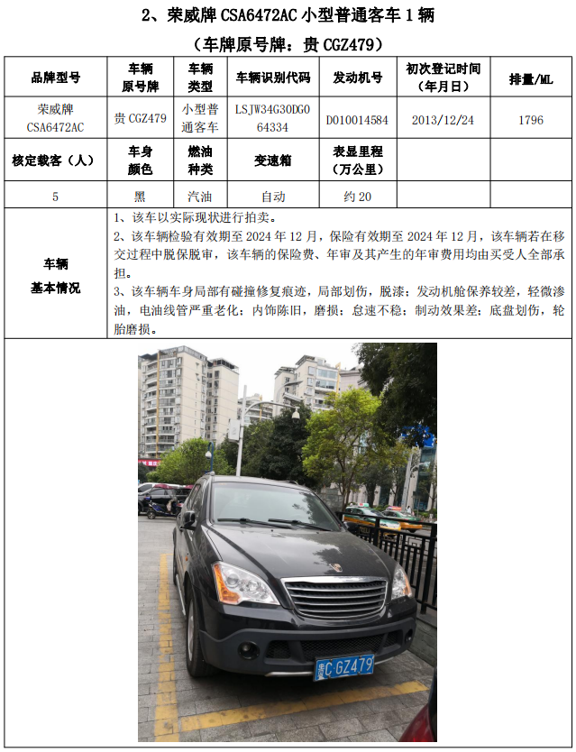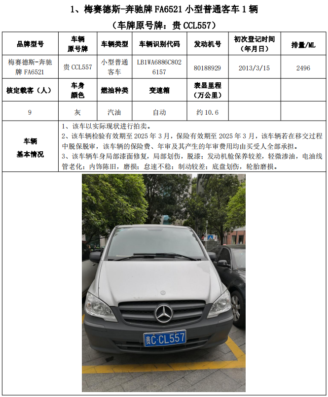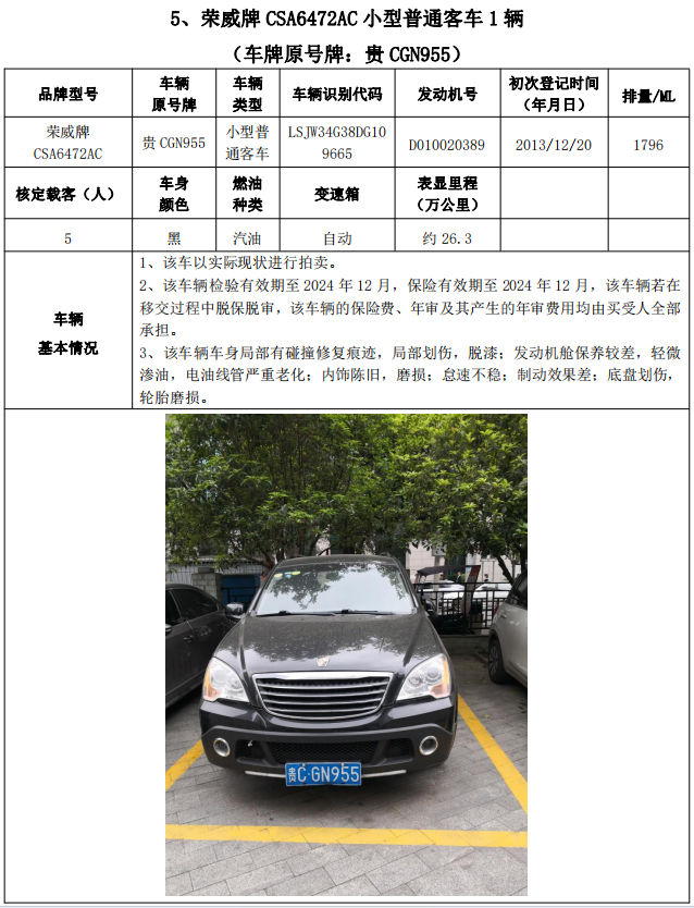 拍品編號2:梅賽德斯-奔馳牌FA6521小型普通客車1輛、榮威牌CSA6472AC小型普通客車3輛、雪佛蘭牌SGM6470TAAD小型普通客車1輛,共計(jì)5輛,整體拍賣