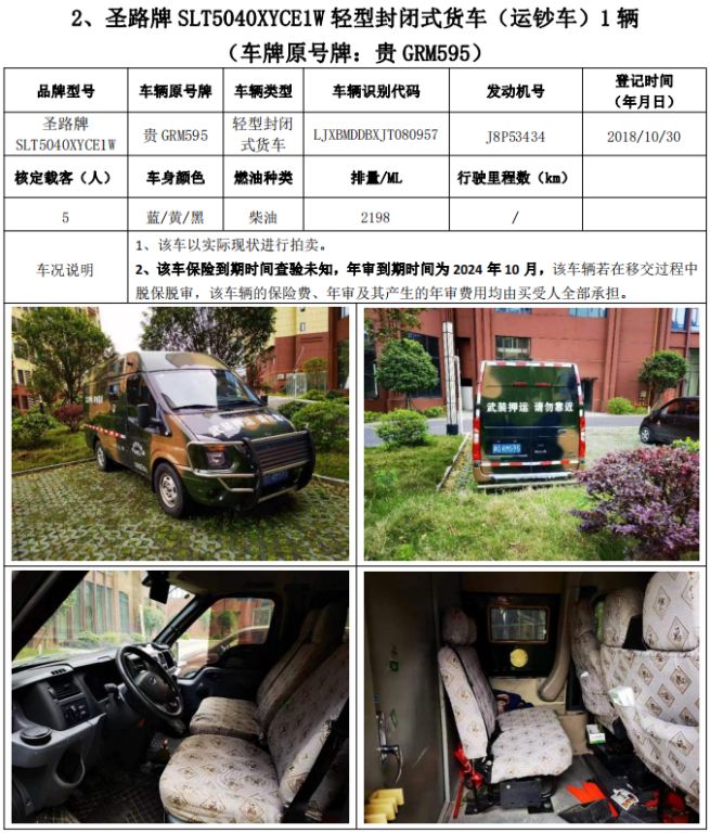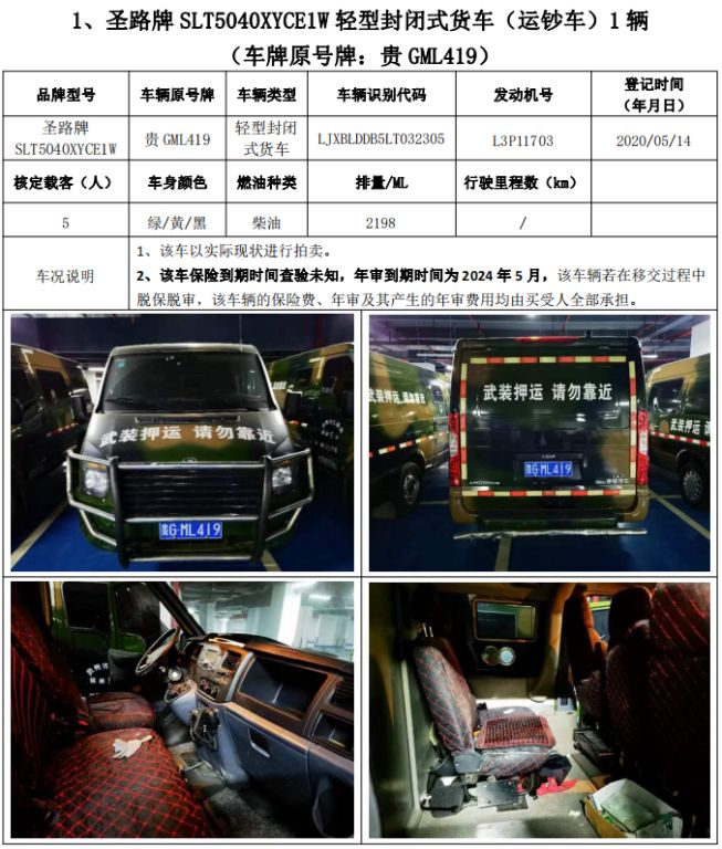 拍品編號(hào)1:圣路牌SLT5040XYCE1W輕型封閉式貨車(運(yùn)鈔車)3輛、圣路牌SLT5042XYCEIL小型專用客車(運(yùn)鈔車)1輛,共4輛,整體拍賣