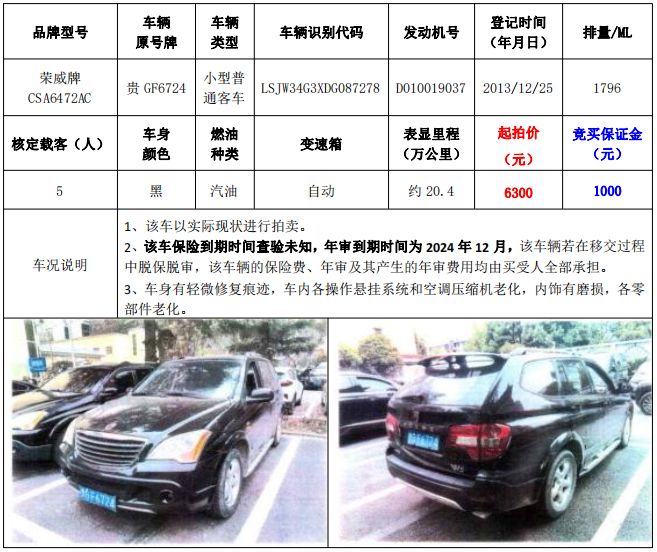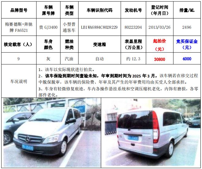 拍品編號1:梅賽德斯-奔馳牌FA6521小型普通客車1輛、榮威牌CSA6472AC小型普通客車1輛,共計2輛(整體拍賣)