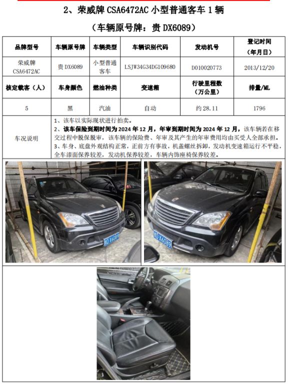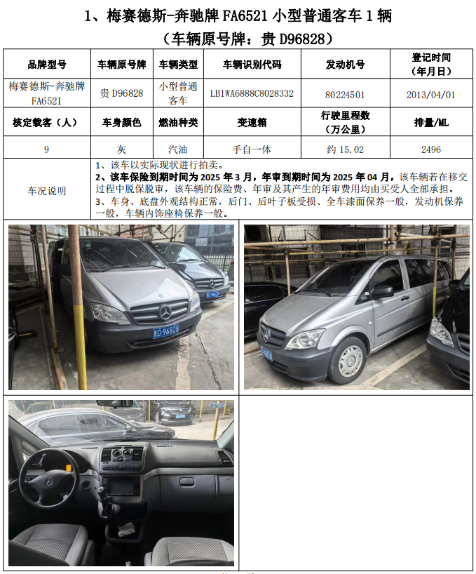 拍品編號1:梅賽德斯-奔馳牌FA6521小型普通客車1輛、榮威牌CSA6472AC小型普通客車2輛,共計3輛(整體拍賣)