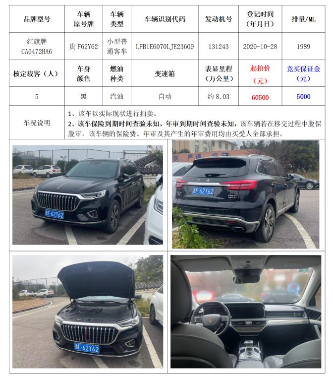 拍品編號(hào)1:紅旗牌CA6472HA6小型普通客車1輛