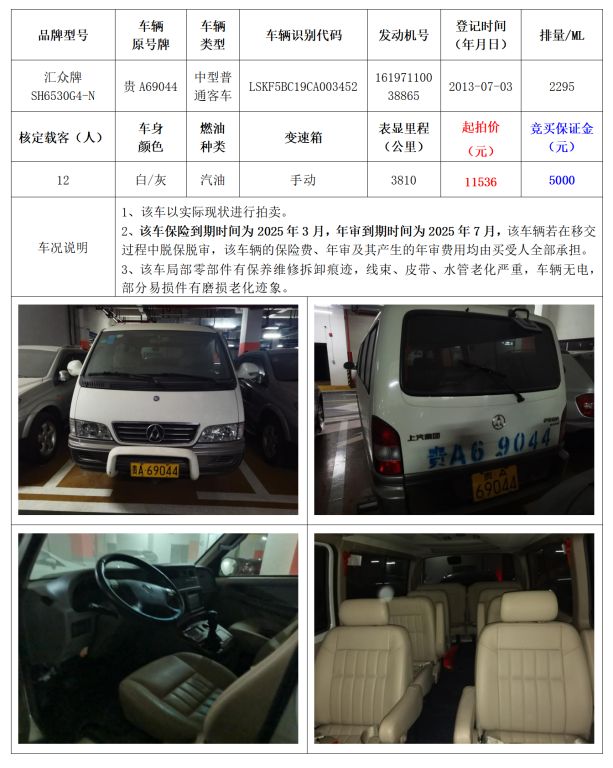 拍品編號(hào)2:匯眾牌SH6530G4-N中型普通客車1輛