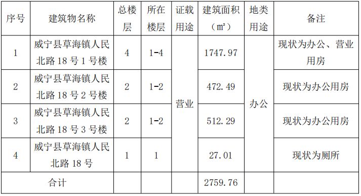標(biāo)的坐落于威寧縣草海鎮(zhèn)人民北路18號(hào)稱(chēng)為1號(hào)樓、2號(hào)樓和3號(hào)樓的三項(xiàng)房屋,房屋建筑面積為:2759.76㎡,混合結(jié)構(gòu),房屋總層數(shù)為4層,拍賣(mài)標(biāo)的所在層數(shù)為1-4層,產(chǎn)權(quán)證號(hào):威房權(quán)證草海鎮(zhèn)字第00007730號(hào),設(shè)計(jì)用途為營(yíng)業(yè)。土地證號(hào):威國(guó)用(2009)第133號(hào),地類(lèi)(用途):辦公用地,使用權(quán)類(lèi)型:作價(jià)出資,使用權(quán)面積:1854.70㎡。