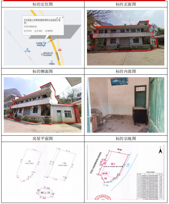 標(biāo)的坐落于安龍縣棲鳳街道辦事處者貴村三塘二組原坡腳信用社(原坡腳鄉(xiāng)政府院內(nèi)),房屋為自建獨(dú)幢房屋,總層數(shù)為2層,證載建筑面積:318.4㎡,實(shí)測(cè)建筑面積:319.76㎡,房屋產(chǎn)權(quán)證號(hào):安房權(quán)證坡腳鄉(xiāng)字第00003456號(hào),設(shè)計(jì)用途為辦公住宅,混合結(jié)構(gòu);土地使用權(quán)證號(hào):安國(guó)用(2014)第21號(hào),證載土地使用權(quán)面積:190.81㎡,實(shí)測(cè)土地使用權(quán)面積:183.8㎡,地類(用途):金融用地,使用權(quán)類型為出讓,終止日期為2054年11月22日止。
