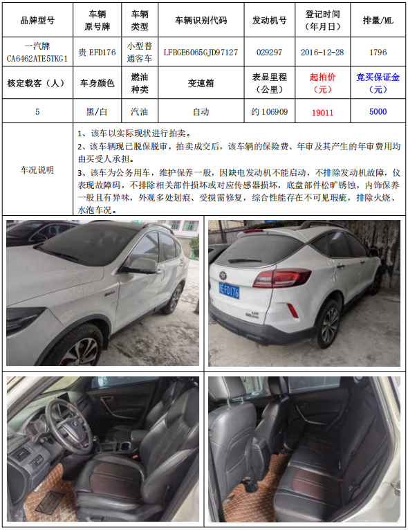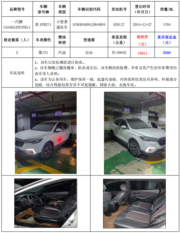 拍品編號(hào)1:一汽牌CA6462ATE5TKG1小型普通客車1輛(車輛原號(hào)牌:貴EFD271)