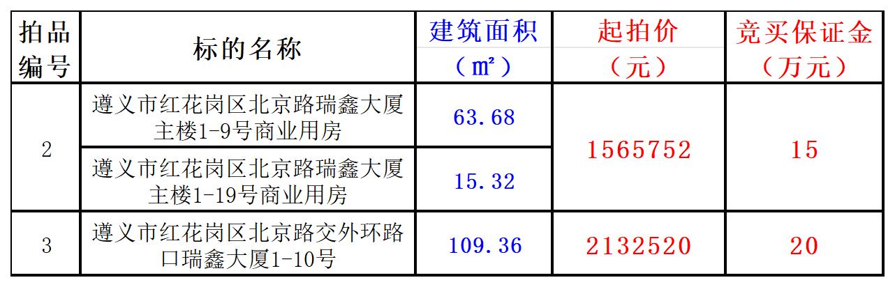3、遵義市紅花崗區(qū)北京路瑞鑫大廈主樓1-10號(hào)商業(yè)用房,建筑面積:109.36㎡,起拍價(jià):2132520元,競(jìng)買(mǎi)保證金:20萬(wàn)元;