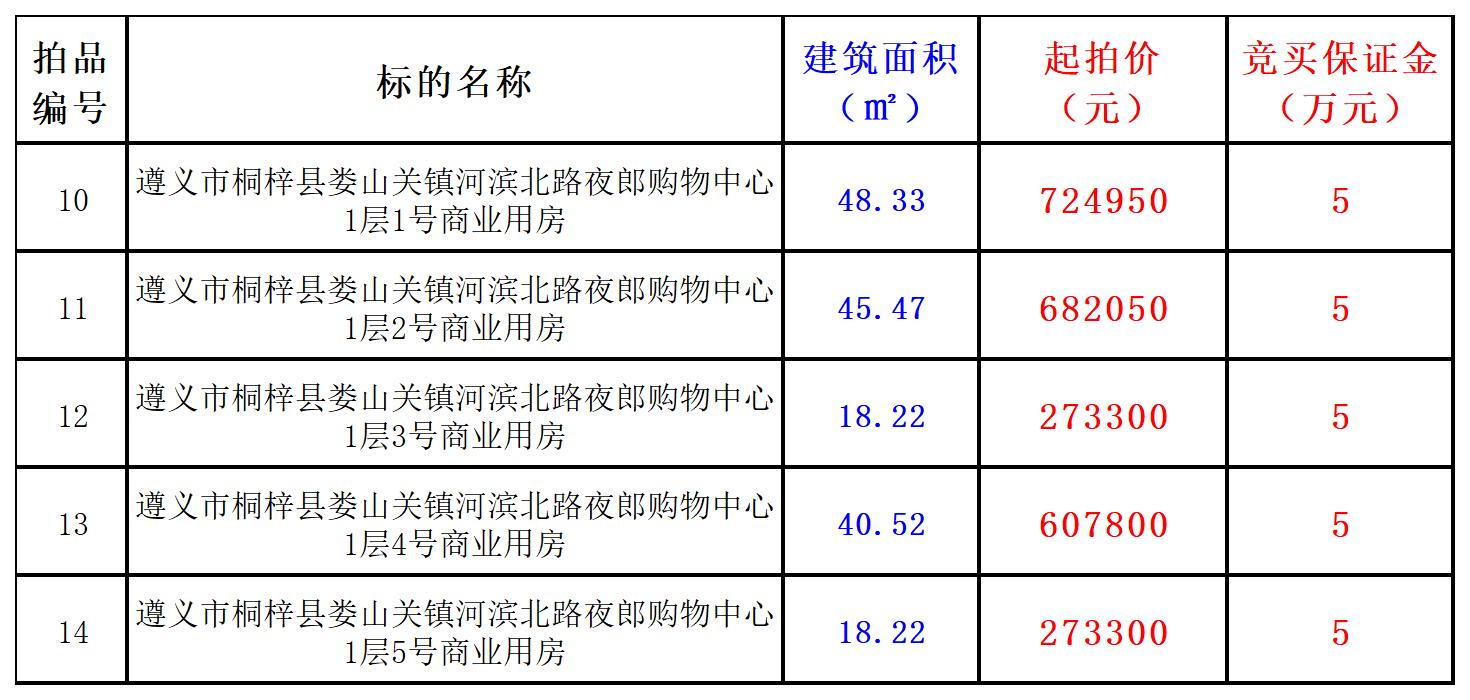 13、遵義市桐梓縣婁山關(guān)鎮(zhèn)河濱北路夜郎購(gòu)物中心1層4號(hào)商業(yè)用房,建筑面積:40.52㎡,起拍價(jià):607800元,競(jìng)買(mǎi)保證金:5萬(wàn)元;