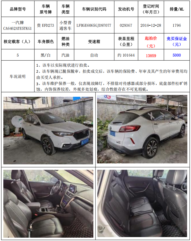 拍品編號(hào)3:一汽牌CA6462ATE5TKG1小型普通客車1輛(車輛原號(hào)牌:貴EFD273)