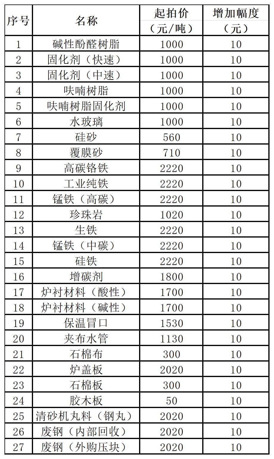 該標(biāo)的為整體拍賣,以第1項(xiàng)堿性酚醛樹脂起拍單價1000元/噸進(jìn)行競價,采取增價方式競拍,每次每噸加價10元,上不封頂;堿性酚醛樹脂每增加10元/噸,第2-27項(xiàng)廢舊原材料同步增加10元/噸。