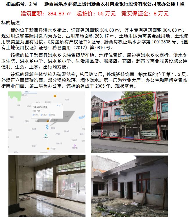 一、黔西縣甘棠鄉(xiāng)街上貴州黔西農(nóng)村商業(yè)銀行股份有限公司老辦公樓1幢(建筑面積:507.06㎡)
