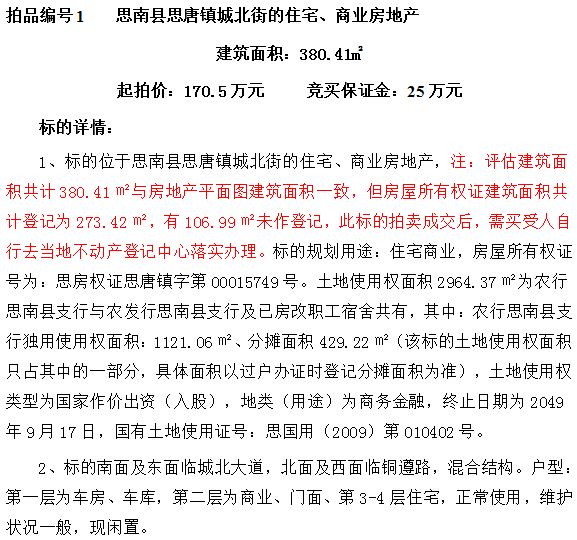 2、思南縣思唐鎮(zhèn)文化街商住房地產(chǎn),建筑面積共:307.45㎡;起拍價(jià):74.7萬(wàn)元;競(jìng)買(mǎi)保證金:10萬(wàn)元
