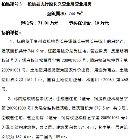 3、松桃縣支行原長(zhǎng)興營(yíng)業(yè)所營(yíng)業(yè)用房,建筑面積共:744.9㎡;起拍價(jià):71.01萬(wàn)元;競(jìng)買(mǎi)保證金:10萬(wàn)元