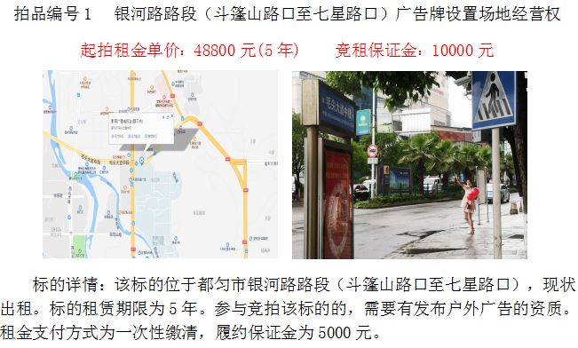 3、都勻市銀河路路段(斗篷山路口至七星路口)廣告牌設置場地經(jīng)營權5年租賃權。