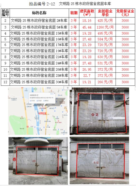 2、都勻市文明路25棟市政府宿舍底層車庫11間3年租賃權(面積約18.16㎡-45.44㎡);