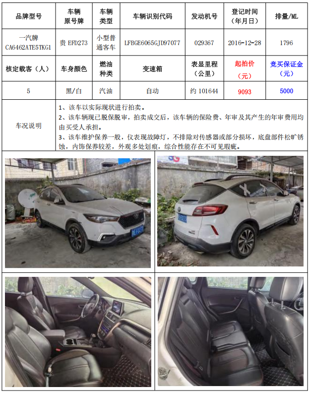 拍品編號2:一汽牌CA6462ATE5TKG1小型普通客車1輛車輛原號牌:貴EFD175)